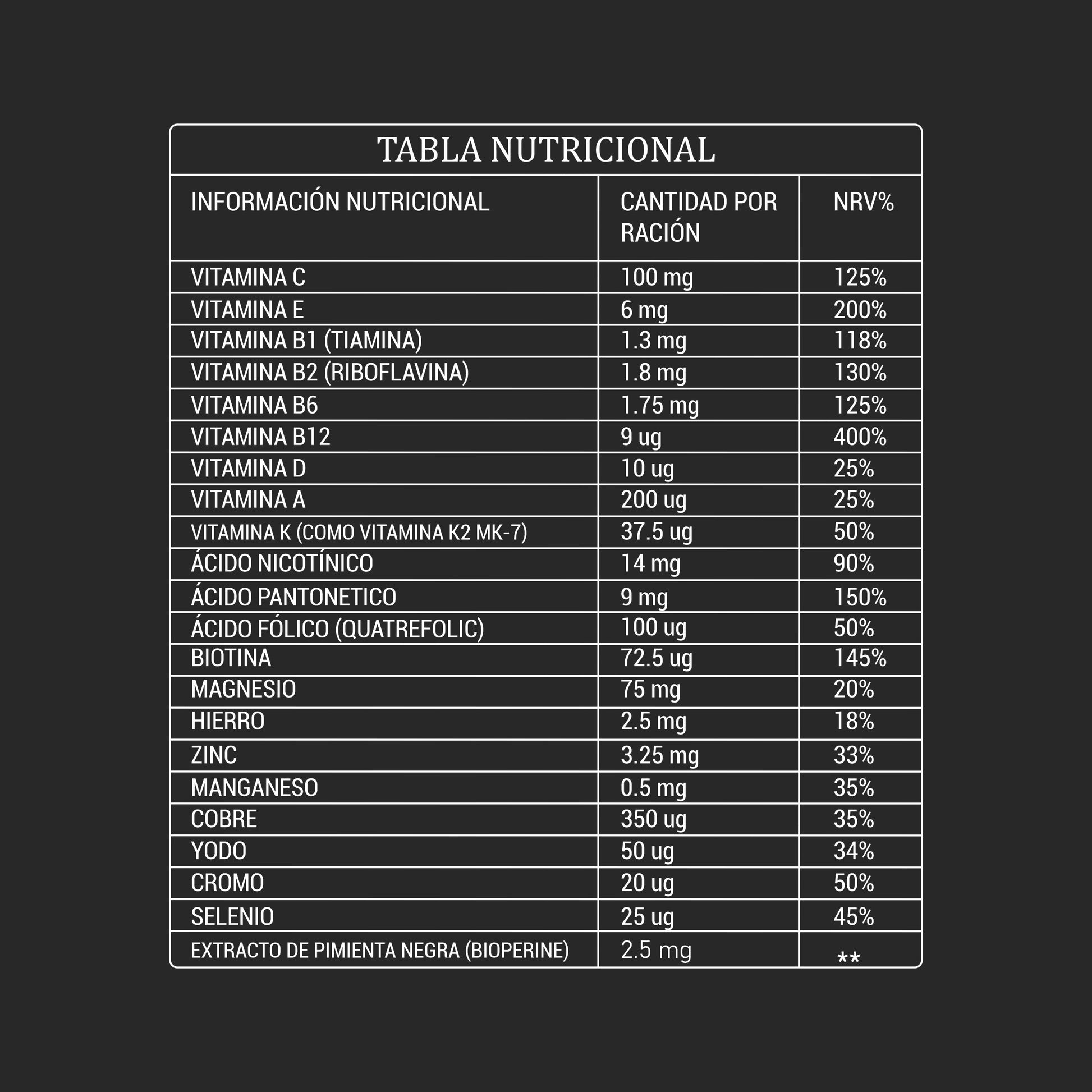 Su fórmula avanzada combina vitaminas antioxidantes (A, C, E, K2, complejo B), minerales esenciales (zinc, selenio, magnesio, cobre) y extractos naturales que trabajan en sinergia para apoyar el equilibrio interno y prevenir el deterioro celular.