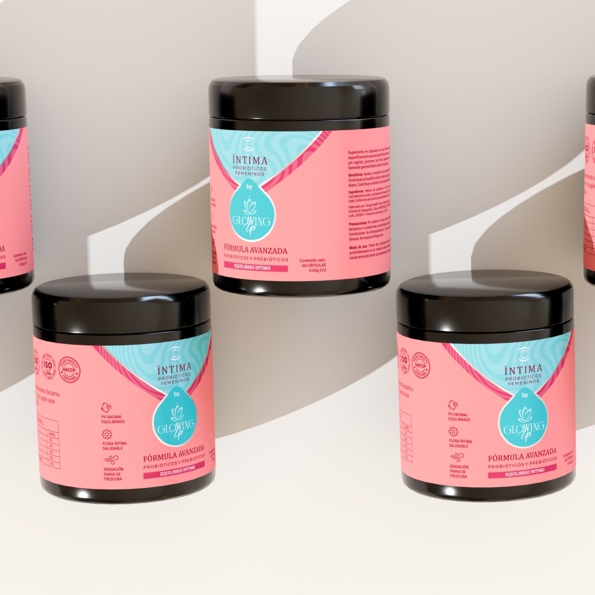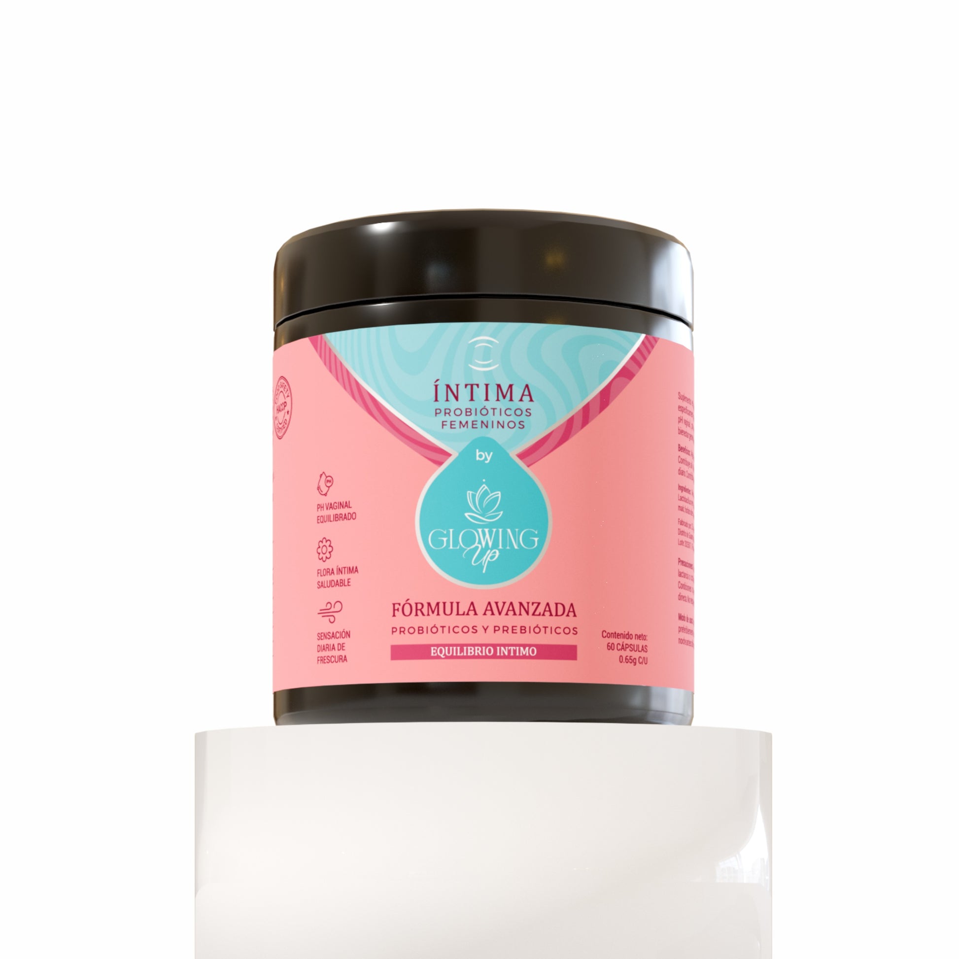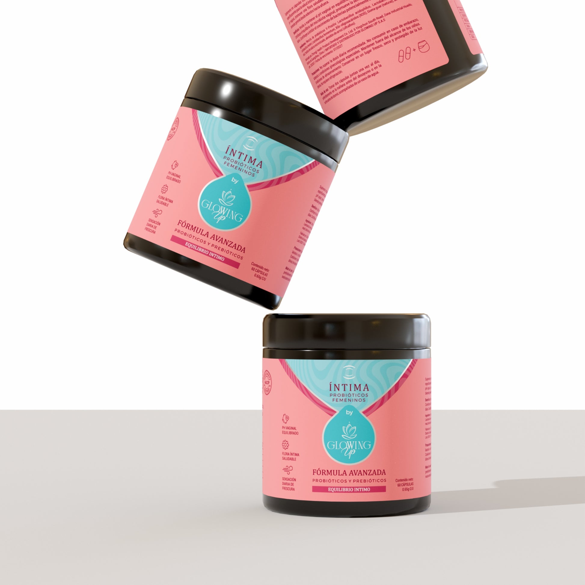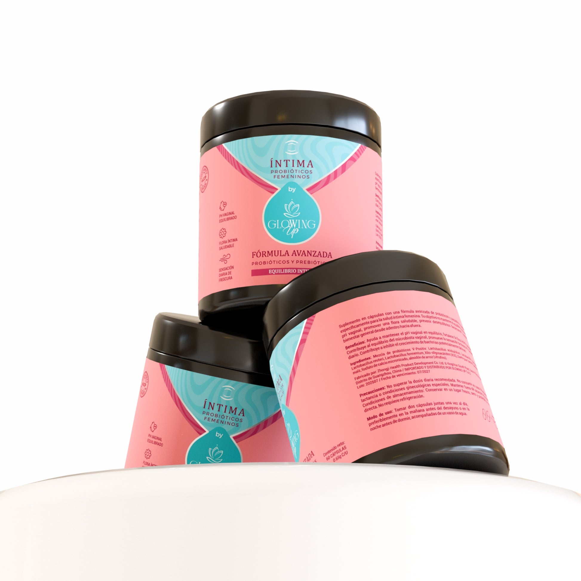 Íntima by Glowing Up combina probióticos y prebióticos clínicamente estudiados que restauran y mantienen el balance natural del ecosistema vaginal, ayudando a prevenir infecciones, regular el pH y fortalecer la inmunidad local.